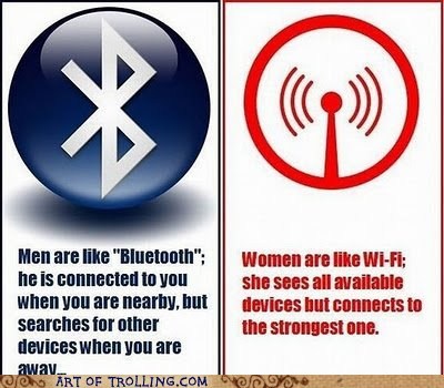 Men Are Like Bluetooth He Is Connected To You When You Are Nearby But Searches For Other Devices Women Are Like Wi Fi She Sees All Available Devices When You Are Away But