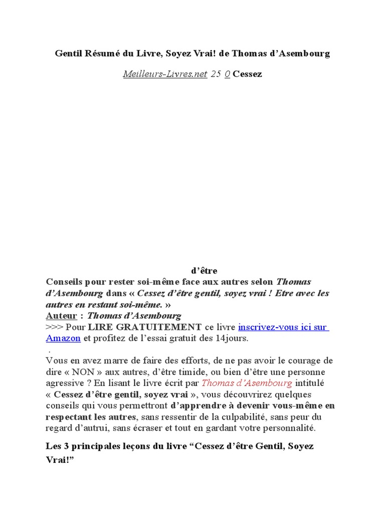 Gentil Resume Du Livre Soyez Vrai De Thomas D Asembourg Conseils Pour Rester Soi Meme Face Aux Autres Selon Thomas Non Violence La Violence